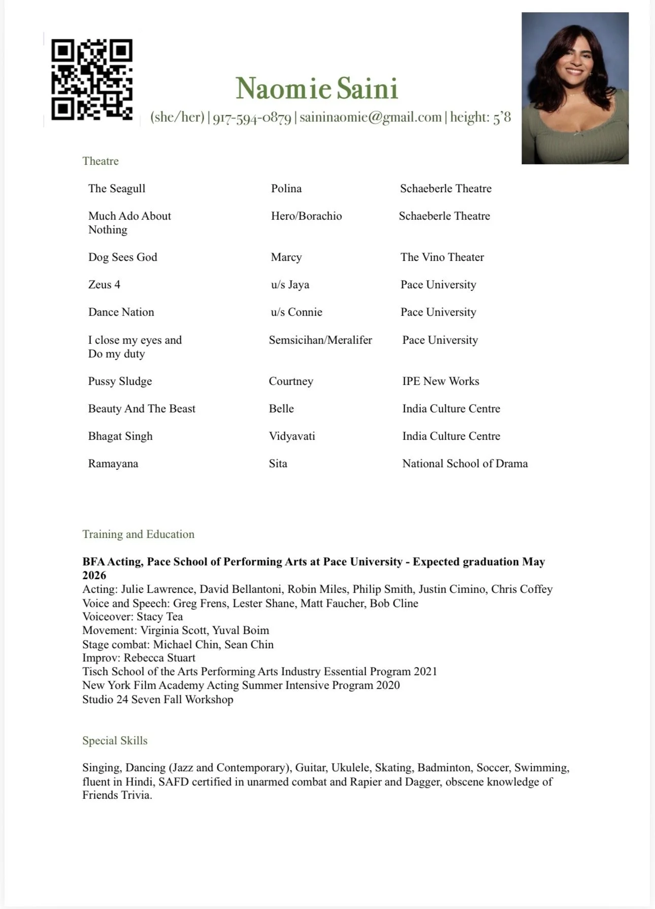 Naomie is a New York–based actor born and raised in New Delhi, India, with a lifelong passion for storytelling that crosses continents. She is currently pursuing her BFA in Acting at the Sands College of Performing Arts at Pace University, where she continues to train with a focus on emotional truth, specificity, and bold artistic choices.